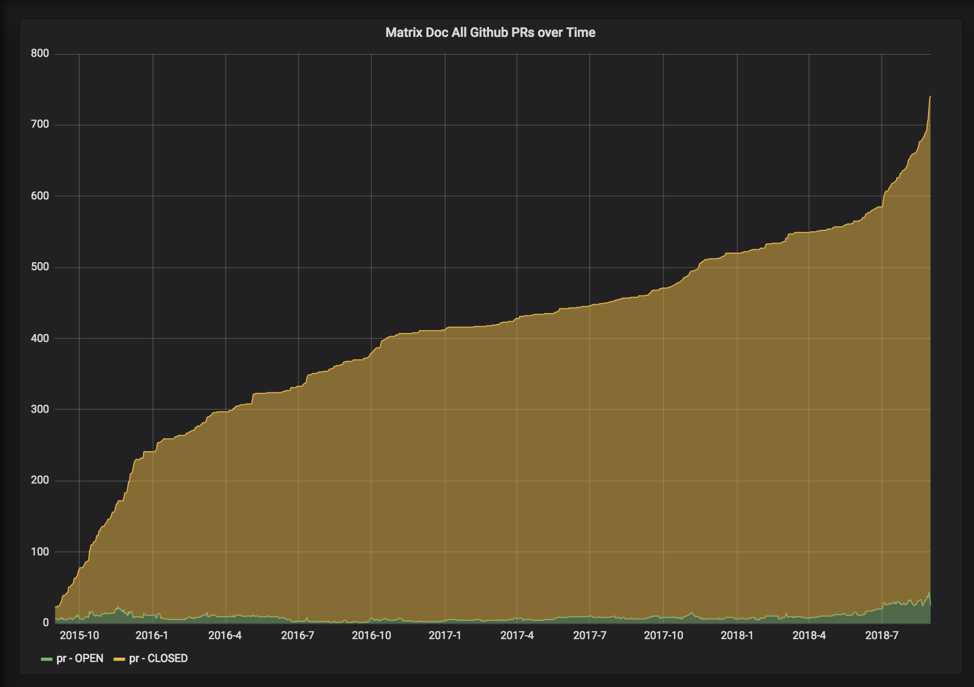 In terms of visualising progress on this spec mission it's interesting to look at the rate at which we've been closing PRs: this graph shows the total number of PRs which are in state ‘open' or ‘closed' on any given day: